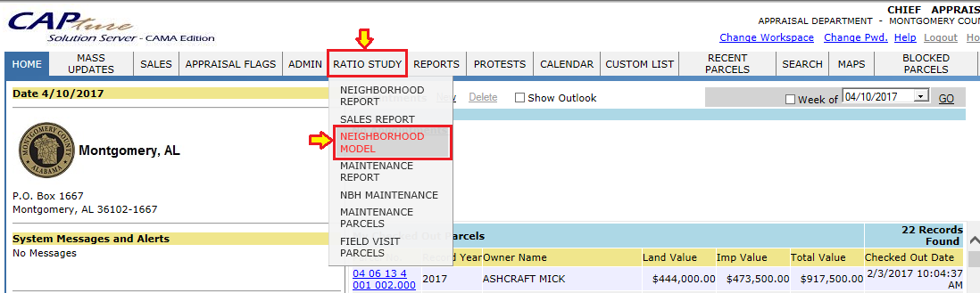 1. For creating Maintenance hover over RATIO STUDY Tab in Appraiser Work space, then click on NEIGHBORHOOD MODEL.