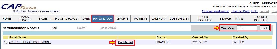 2. Click on Dashboard Link, enter the Maintenance Tax Year then click the Go button. A list of Neighborhoods are displayed.