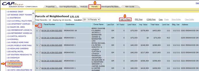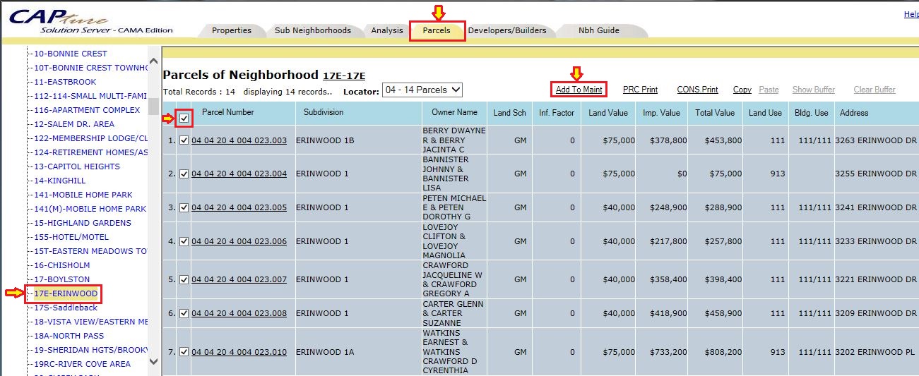 3. Select the respective NBH under Neighborhood Analyzer and click on Parcels Tab. It will display all the parcels in that NBH.