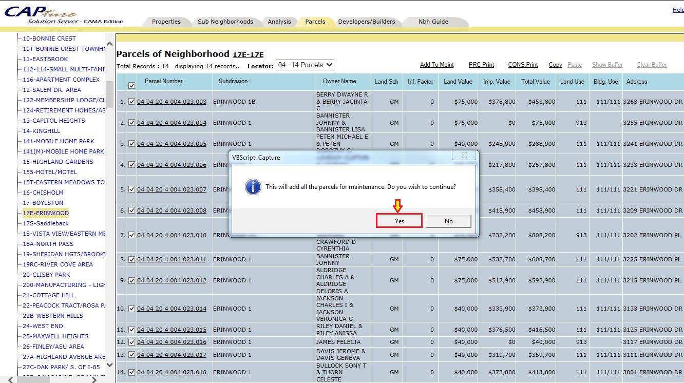5. In this below screen shot, click ‘Yes’ will add all the parcels to Maintenance.