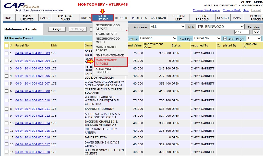 6. All the parcels added to Maintenance are assigned to the appraiser of the NBH. Hover over Ratio Study and click on ‘Maintenance Parcels’ to access the NBH Maintenance Report.