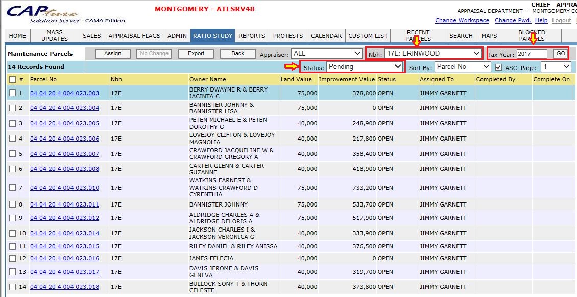 13. The user can find the assigned Parcels by selecting default drop downs like User, Type, NBH, Status and Tax Year.