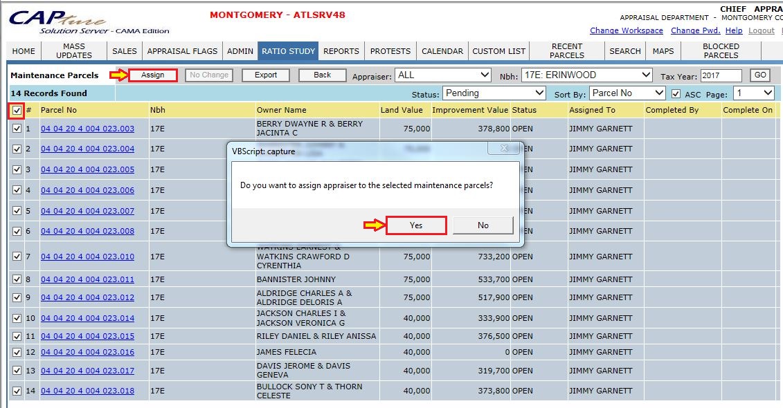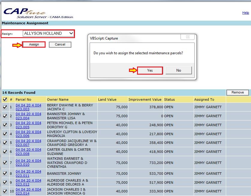 8. The Appraiser may re-assign the parcels to a different user. Click Yes to reassign the parcel(s) in below screen shot. The Maintenance Assignment window opens, select the respective user to assign and click on the “assign” button. The selected parcels are now assigned to that particular user.