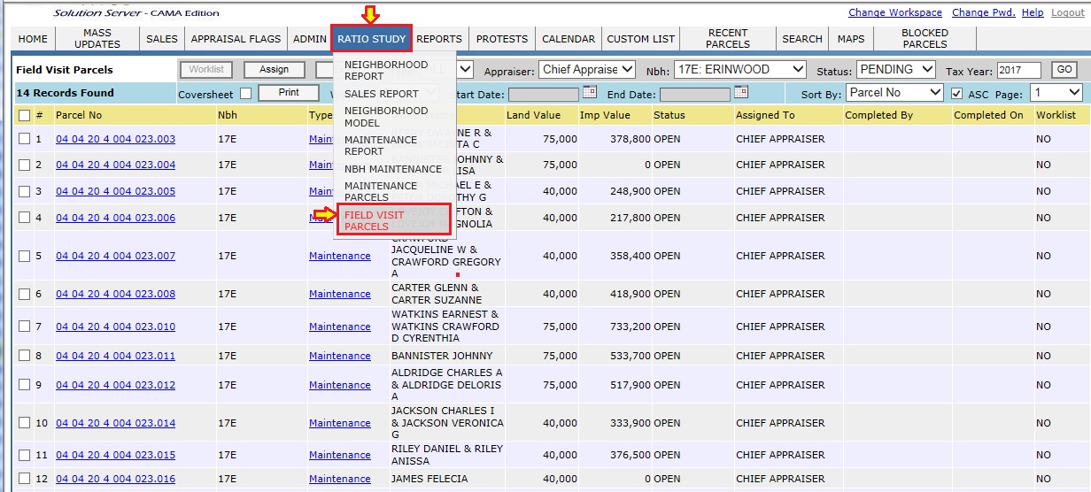 11. View Field Visit Parcels by hovering over RATIO STUDY, then clicking FIELD VISIT PARCELS. Field Visit Parcels will display the parcels which are assigned to that user.