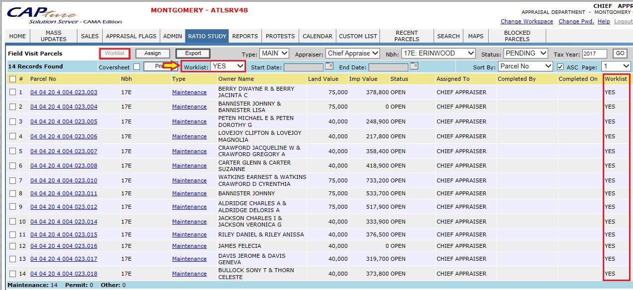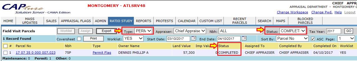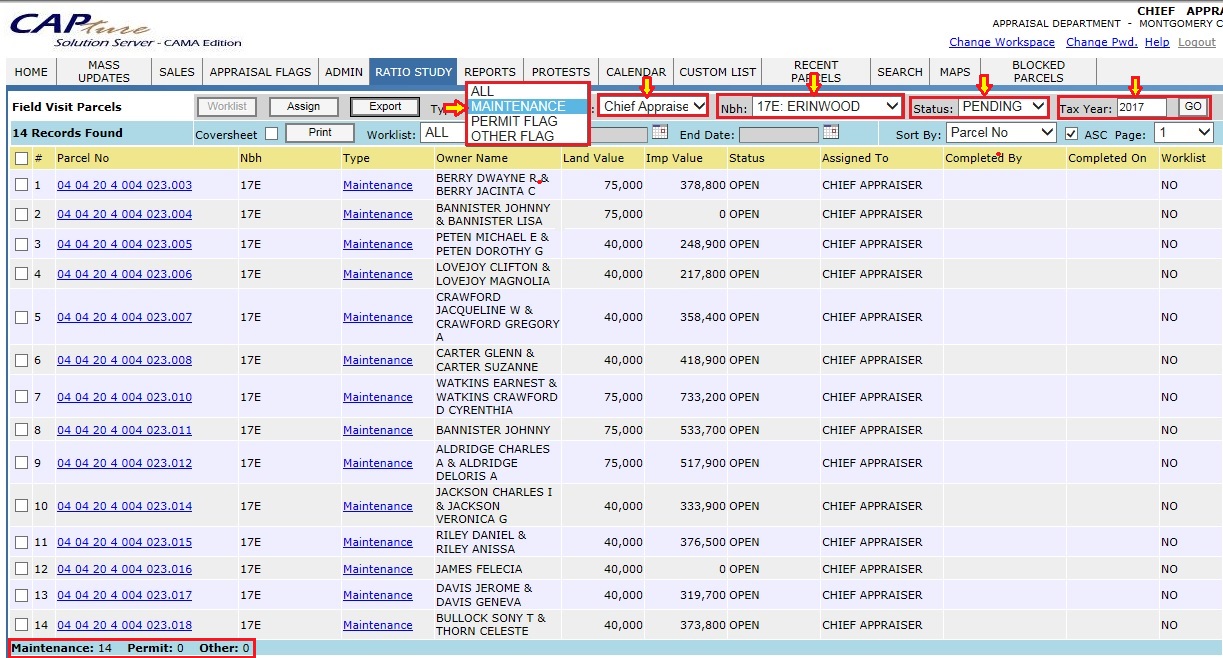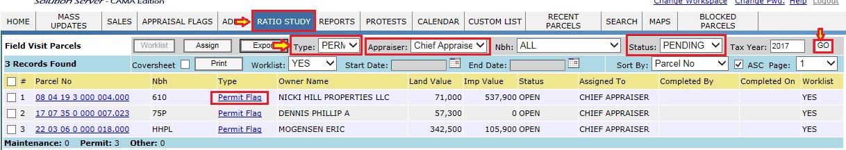 Field Visit Parcels: This report displays all kinds of Flags like Maintenance Flags, Permit Flags and Other Flags. Under RATIO STUDY ->FIELD VISIT PARCELS.