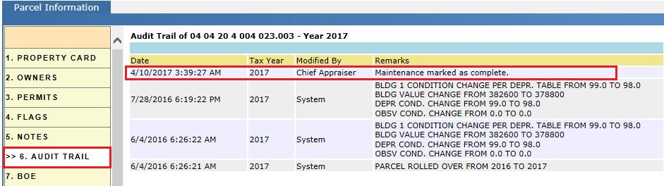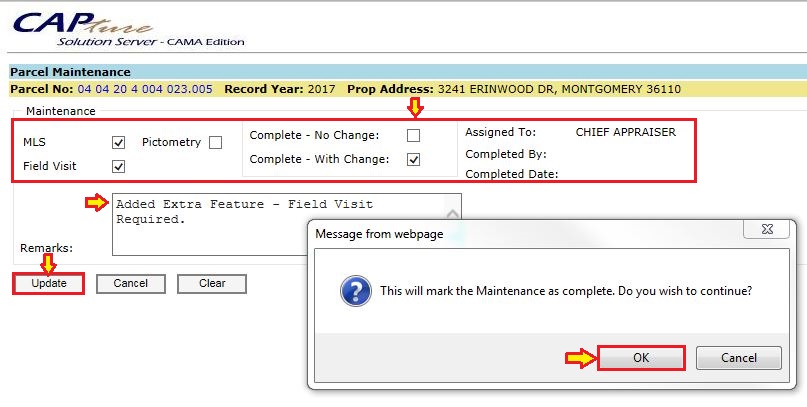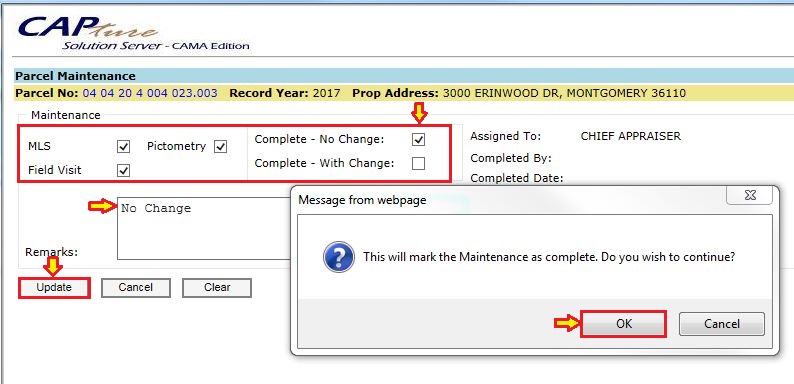 Completed with No Change: On parcel Maintenance window mark the required changes and update. This will mark the maintenance as Complete.