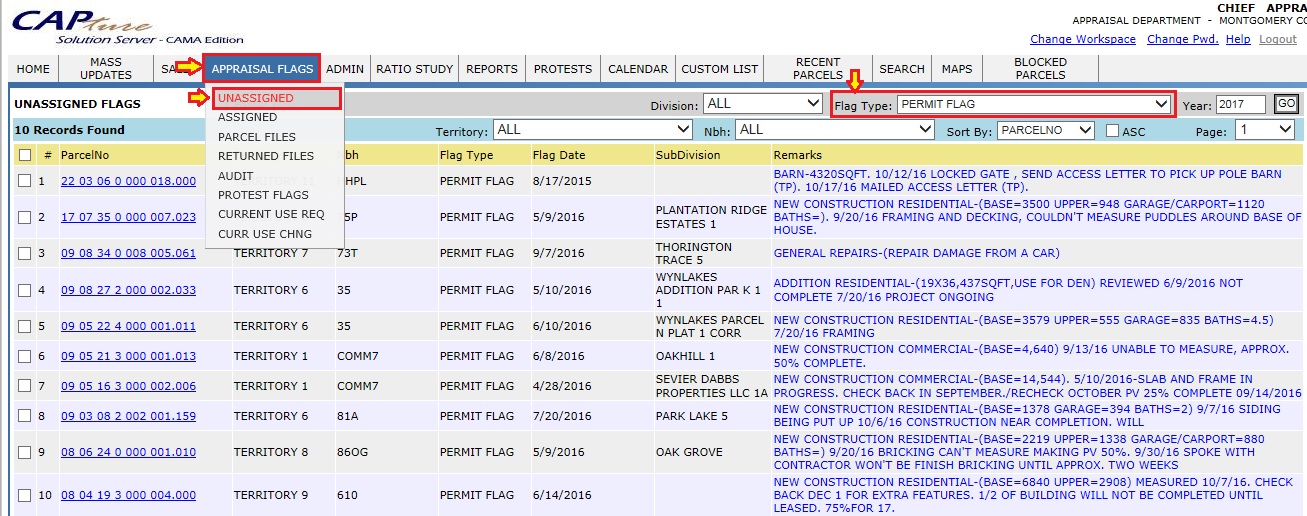 2. Hover over Appraisal Flags and go to ‘Unassigned’. Select the Flag type as PERMIT FLAG with respective Tax Year and click on Go. This will display all unassigned flags for the permits.