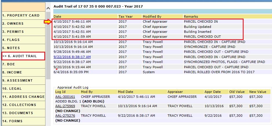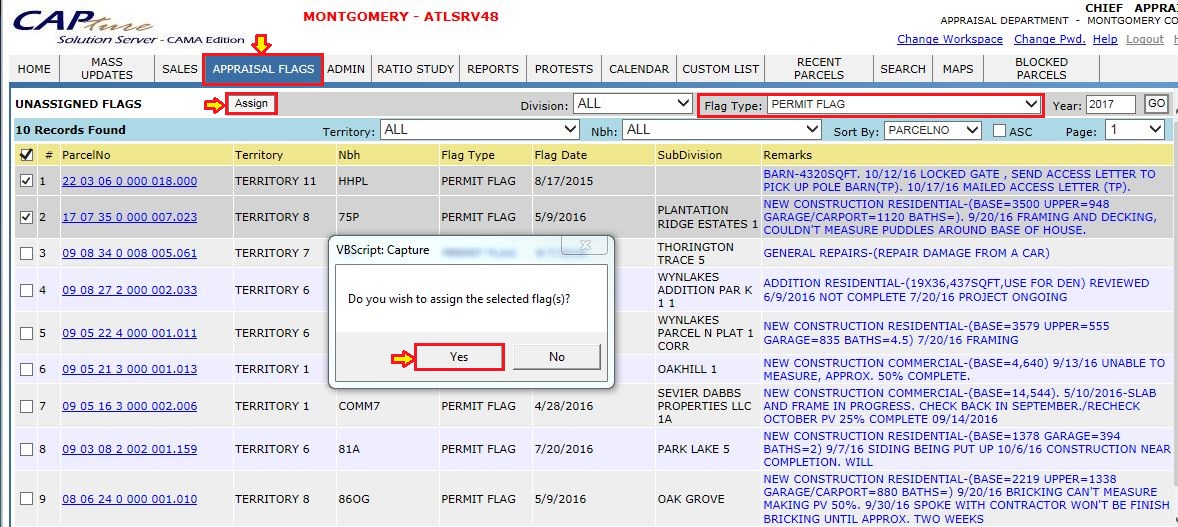 The flags which comes from Assessor’s office are known as Assessment Field Checks. The Assessor will update the assessment information and raise a flag for field Visit whenever a Tax Payer comes to Assessors Office and provides information about appraisal modifications or improvements.