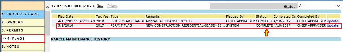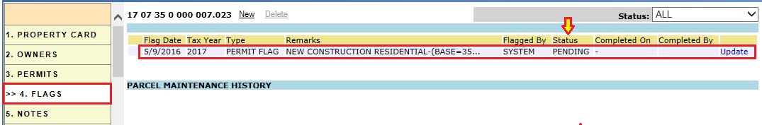 5. Within the parcel under Flags tab we can find the Permit Flags. The Permit Flag remarks indicate the modification that is to be completed on the parcel, such as Addition, New construction and other improvements.
