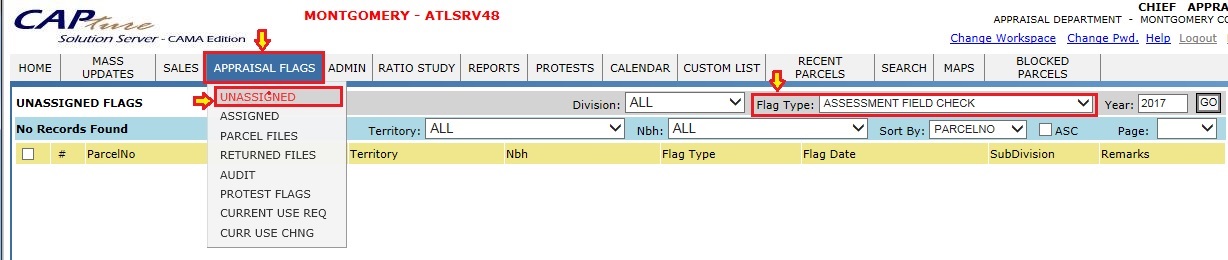 2. Hover over Appraisal Flags and go to ‘Unassigned’. Select the Flag type as ASSESSMENT FIELD CHECK with respective Tax Year and click on Go. This will display all unassigned flags for Assessment field checks if available.