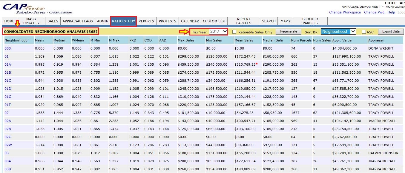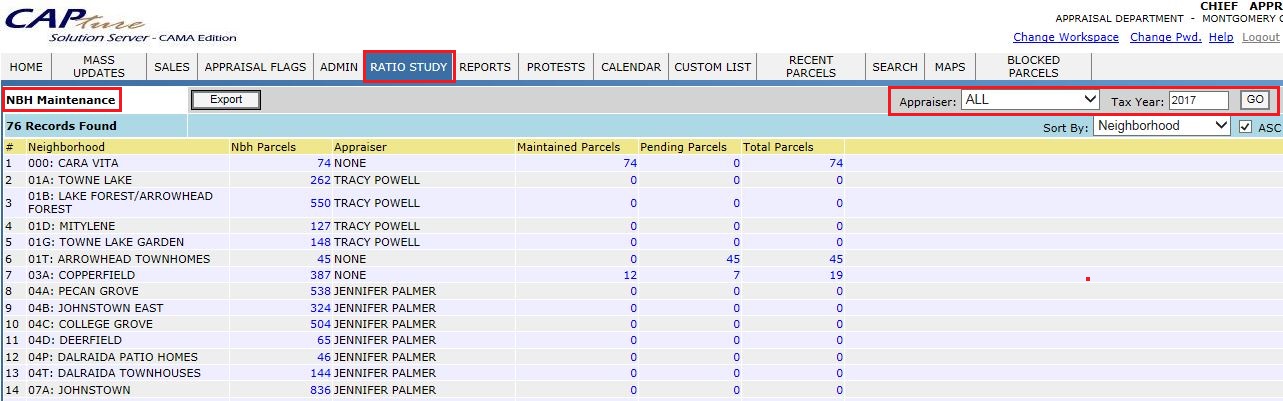 NBH Maintenance: This report shows a NBH’s maintenance for the respective User and Tax Year, aslo displays status of maintenance parcels. Under RATIO STUDY Tab -> NEIGHBORHOOD MAINTENANCE