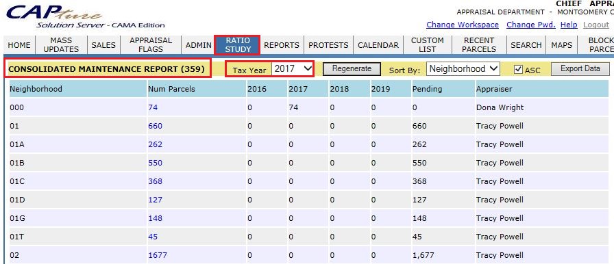 Maintenance Report: This report shows the Maintenance report with respective NBH and Tax Year. Under RATIO STUDY Tab -> MAINTENANCE REPORT.