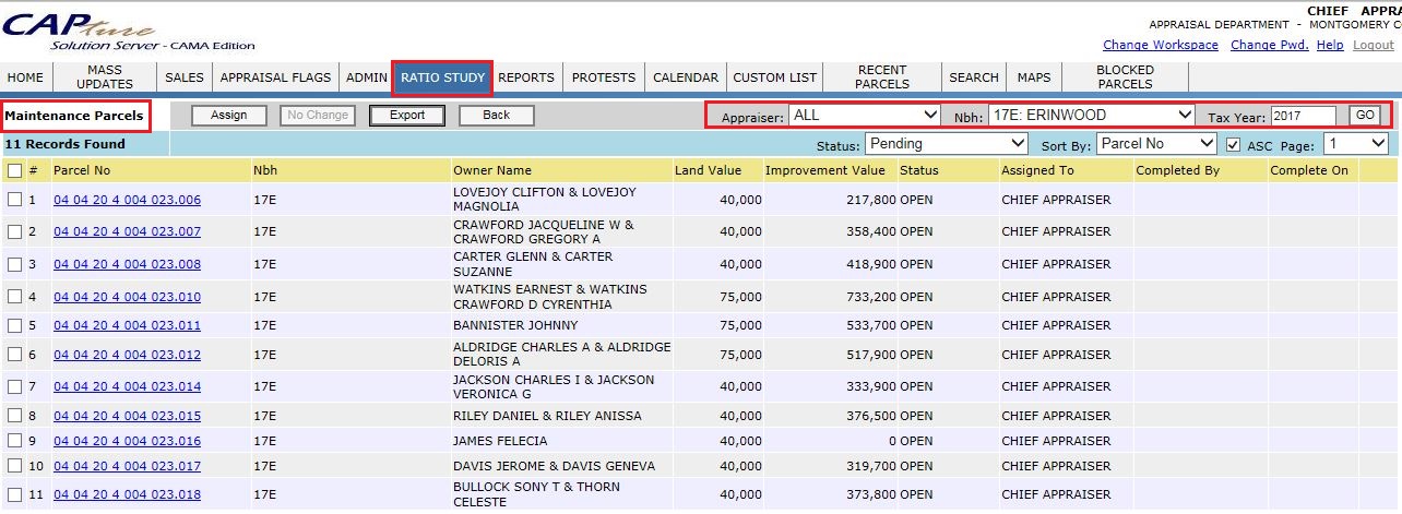 Maintenance Parcels: This report shows the created maintenance parcels with respective User, NBH based on Tax Year. Under RATIO STUDY Tab -> MAINTENANCE PARCELS.