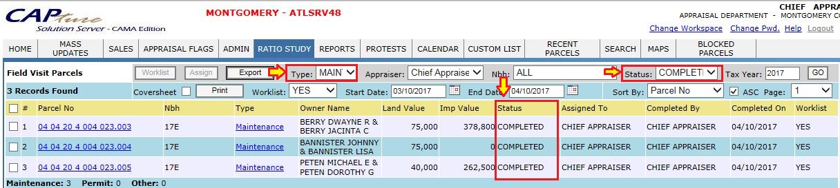 To check Maintenance completed report hover over RATIO STUDY -> FIELD VISIT PARCELS and select the respective Type-> Maintenance, User, Date, Status-> Completed and Tax Year.